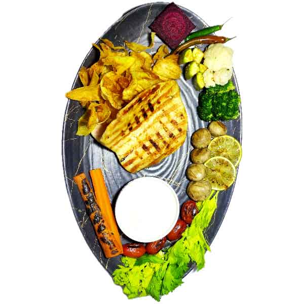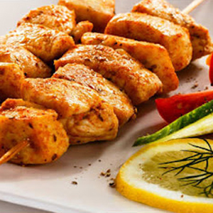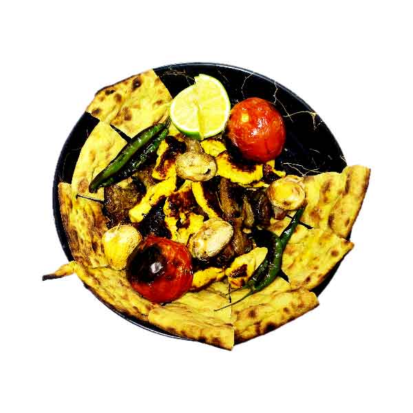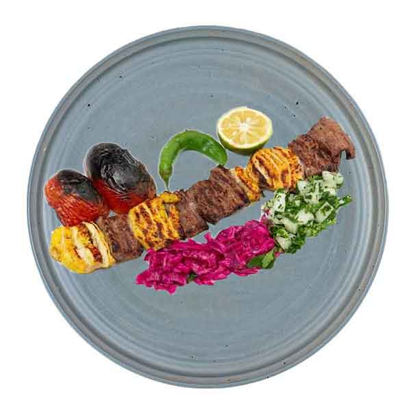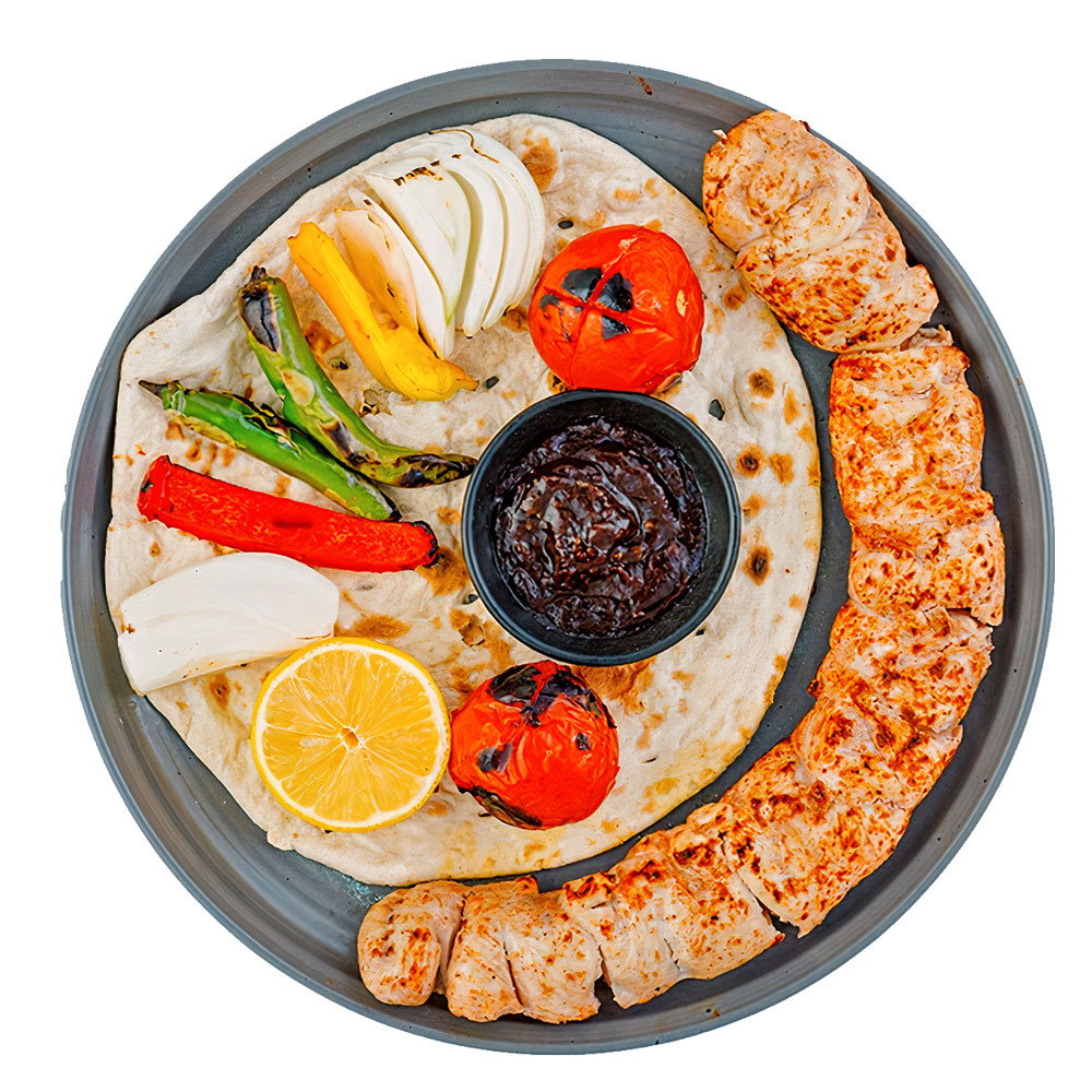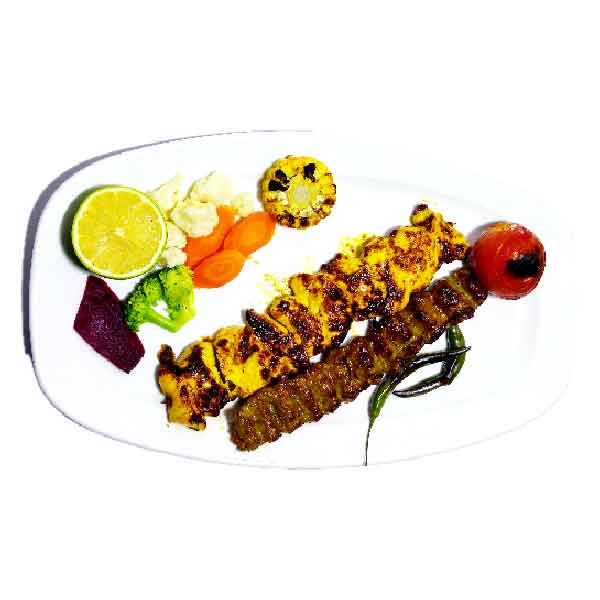 یک سیخ جوجه ۲۰۰ گرمی، یک سیخ چنجه ۱۸۰ گرمی، یک سیخ کوبیده ۹۰ گرمی، قارچ، گوجه