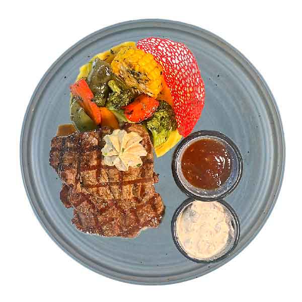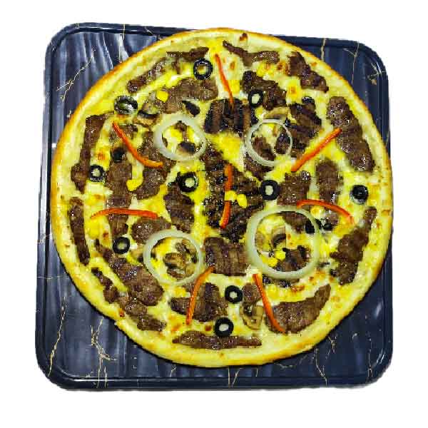 ۱۵۰ گرم استیک فیله، پنیر مازارلا، قارچ، فلفل دلمهای، سس سیر، سس ناپول