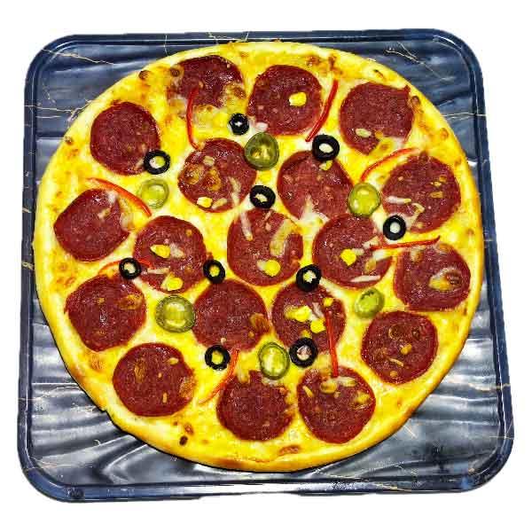 ۵۰ گرم ژامبون، ۵۰ گرم بیکن، ۵۰ گرم پپرونی، ۱۰۰ گرم پنیر مازارلا، قارچ، فلفل دلمهای