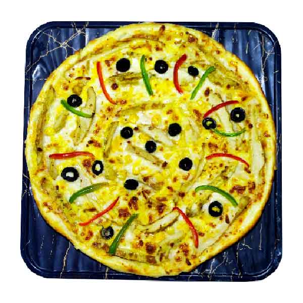 ۱۵۰ گرم شنسیل مرغ گریل شده، ۱۰۰ گرم پنیر مازارلا، قارچ، فلفل دلمهای، سس ناپول